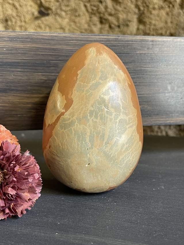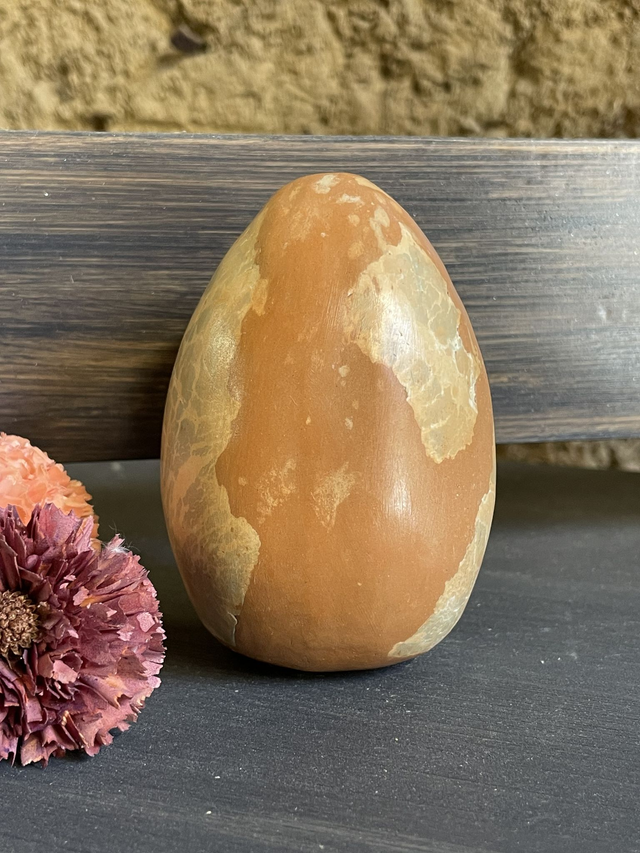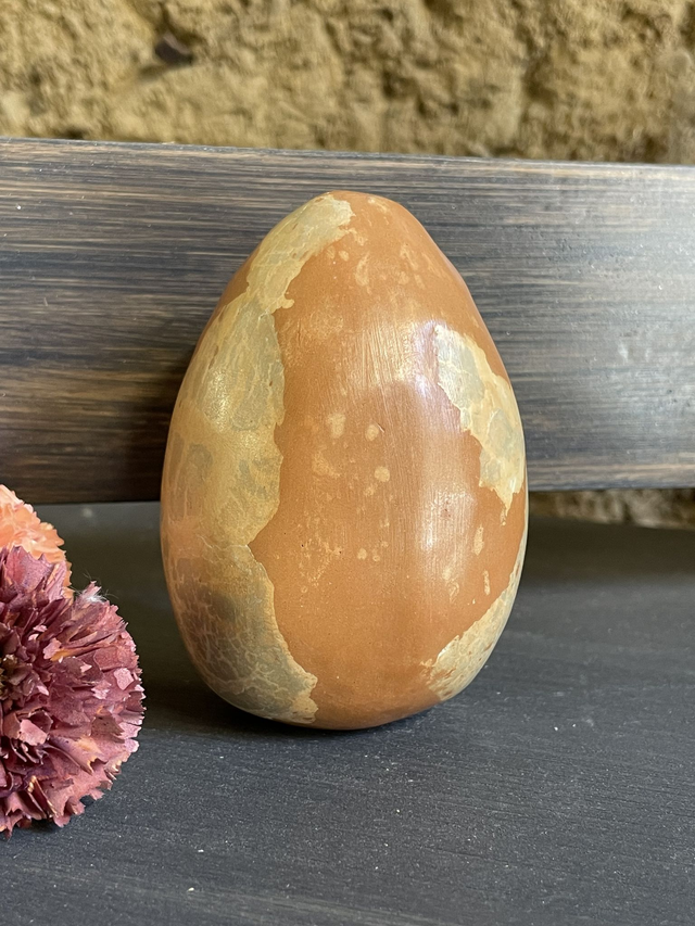 Symbole de création, de naissance ou renaissance, du foyer de la protection, œuf en faïence, mêlant plusieurs techniques de modelage, Objet décoratif, son côté terre polie et patiné à la cire naturelle, agréable au toucher, invitant à le prendre en main pour un doux contact !